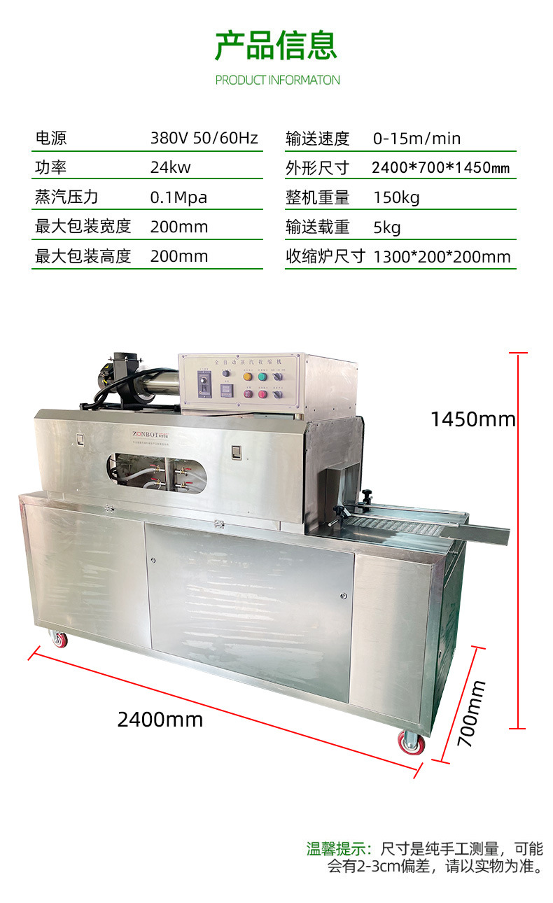 • 尺寸定制:根據用戶產品的尺寸,定制收縮通道的大小。例如,對于超長的管材產品,可定制加長型收縮通道,確保產品能完整地通過并得到良好的收縮包裝。