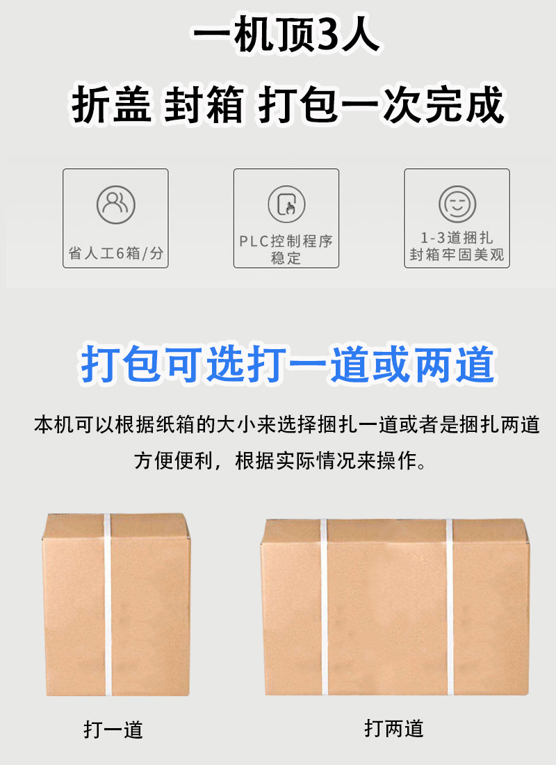 - 借助先進的機械結(jié)構(gòu)和精確的控制系統(tǒng),一字封箱打包機在封箱和打包過程中能夠?qū)崿F(xiàn)高精度操作。封箱時,膠帶粘貼的位置準確,折頁整齊規(guī)范;打包時,打包帶的環(huán)繞位置、張力和熔接質(zhì)量都能精確控制。這種高精度的包裝效果不僅提高了包裝的美觀度,更重要的是增強了包裝的牢固性,有效保護了箱內(nèi)產(chǎn)品。