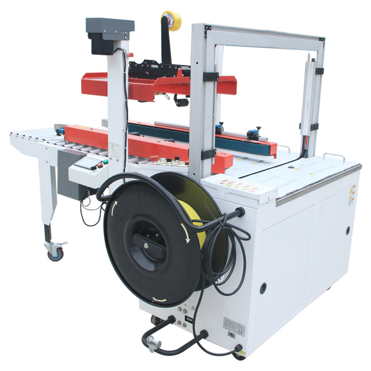 • 接著,紙箱被輸送到膠帶供給系統處。膠帶從膠帶架被拉出,通過膠帶滾輪的引導,將膠帶粘貼在已經折疊好的紙箱封口處。在粘貼過程中,壓輪會對膠帶施加壓力,使膠帶緊密貼合在紙箱上。當紙箱移動到合適位置,膠帶覆蓋完整個封口長度后,膠帶切割器將膠帶切斷,完成封箱過程。最后,封好的紙箱被輸送帶送出機器。