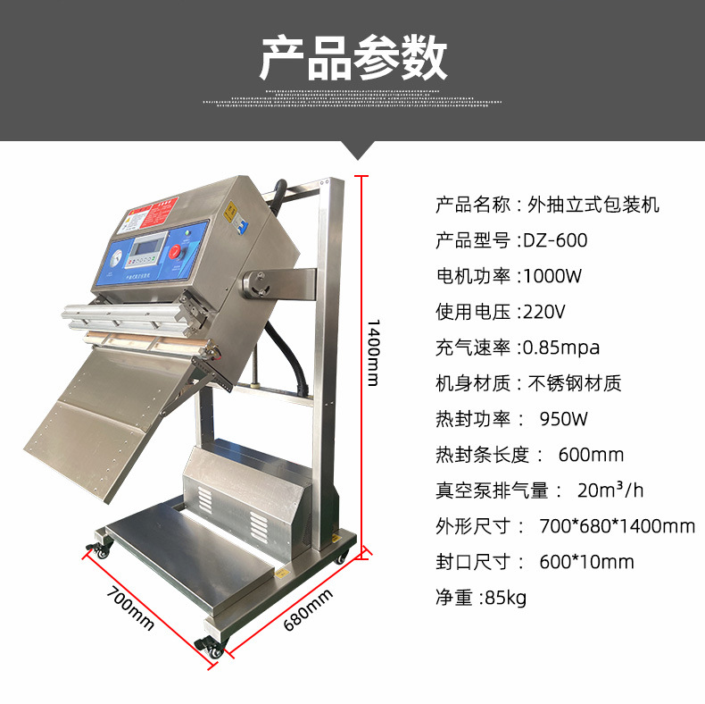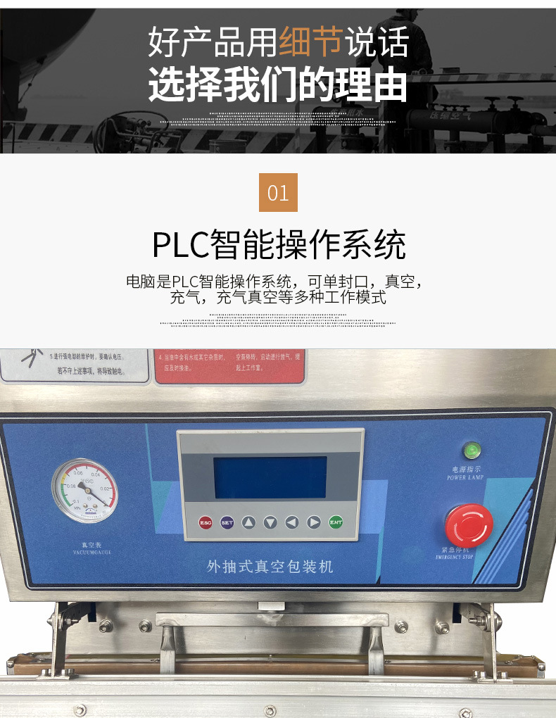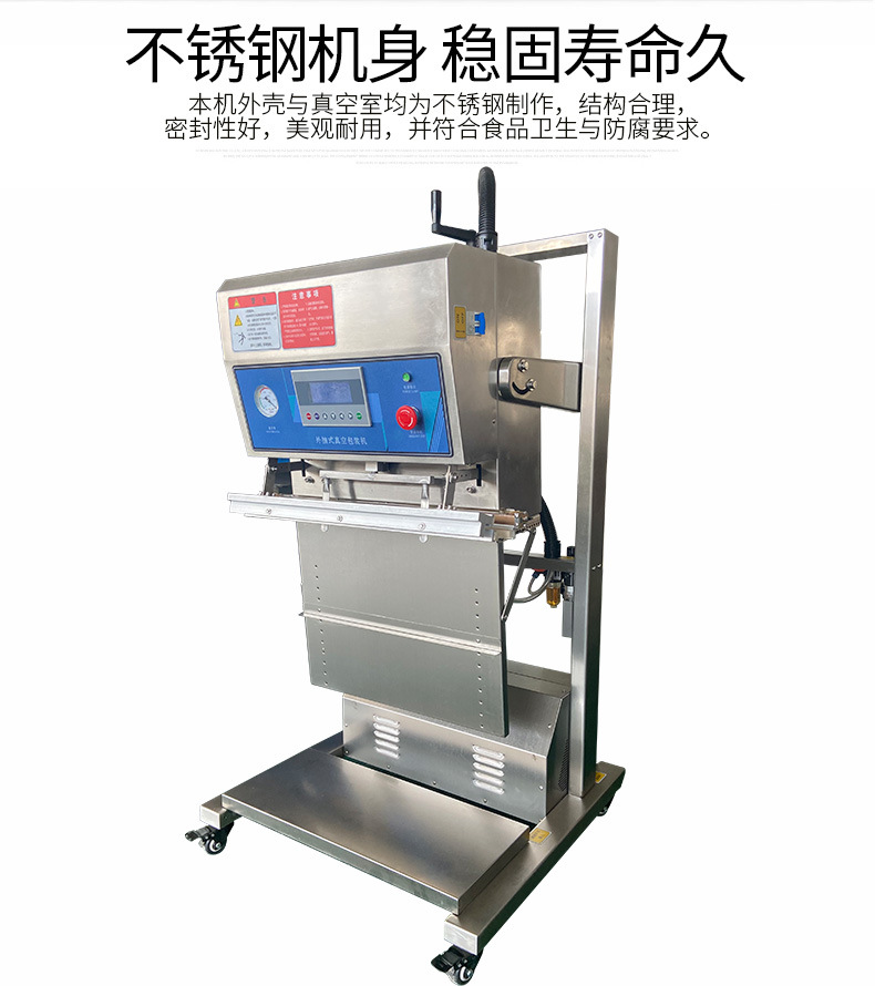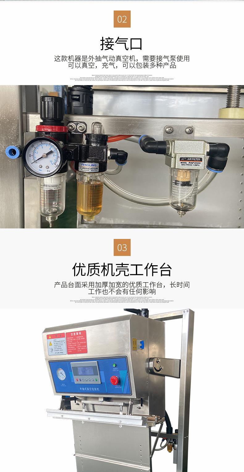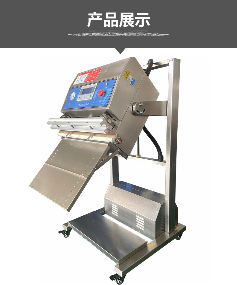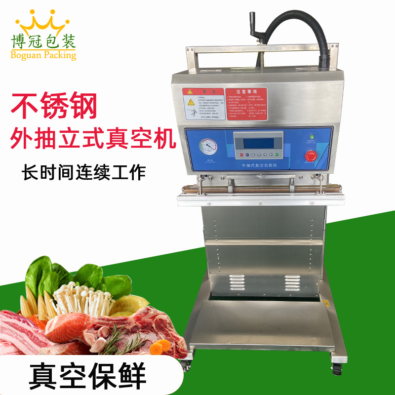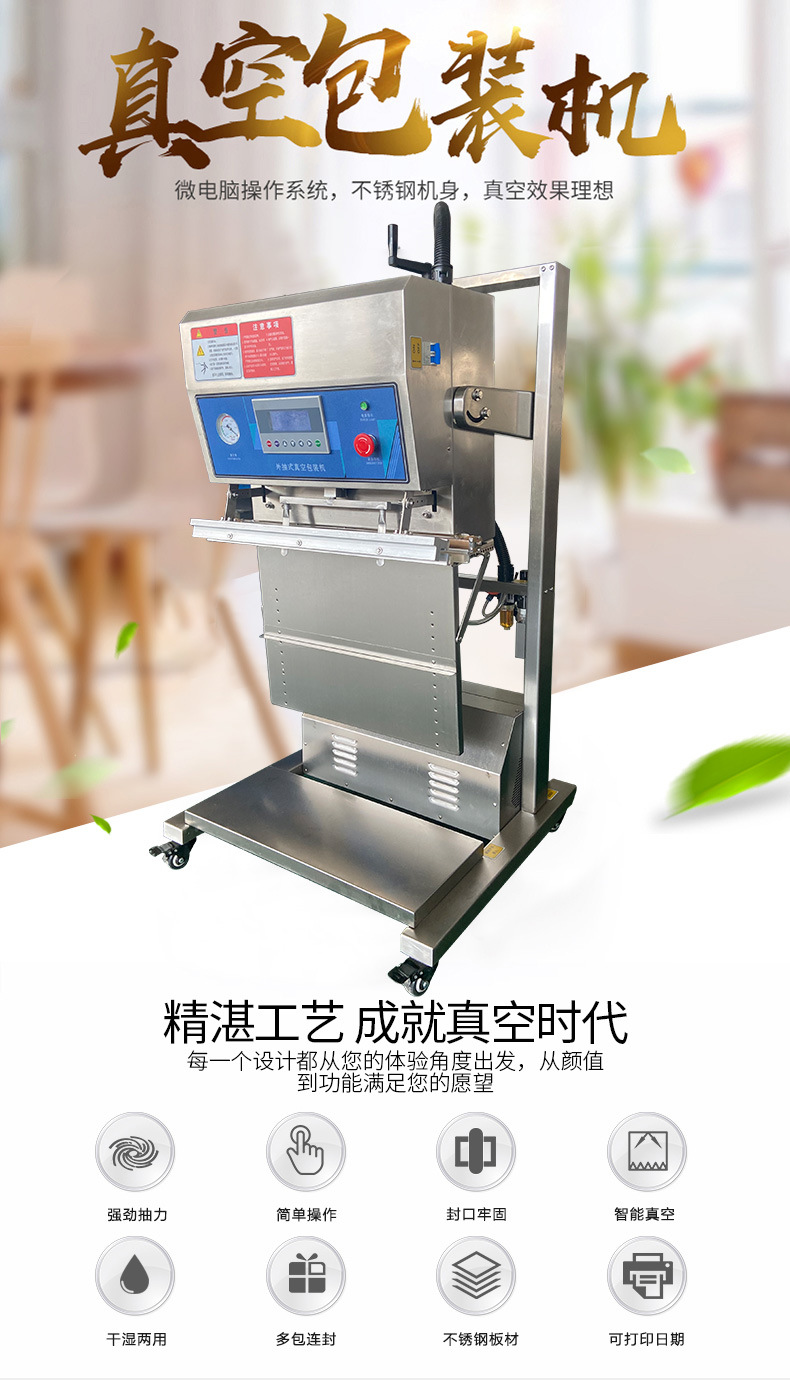 不銹鋼立式外抽真空包裝機能在短時間內使包裝袋達到較高的真空度,是普通包裝設備的 4 倍左右,工作效率高