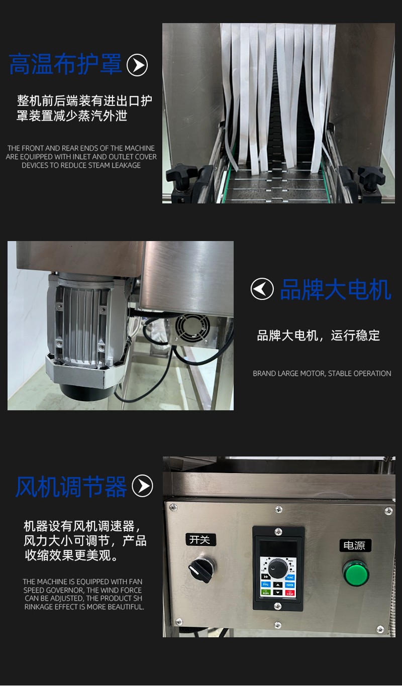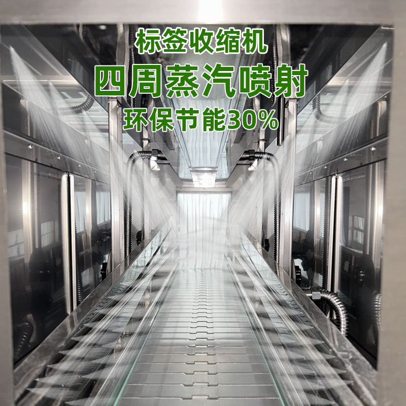 - 加熱效果優越:利用蒸汽恒溫且溫度擴散均勻的特性工作,能達到普通電熱紅外加熱收縮機不可比擬的效果。設備采用加熱器加熱水產生蒸汽,無需另外配備蒸汽鍋爐。主機有主副 2 個加熱器,可根據生產速度調節功率大小,輸送帶采用無級調速,輸送速度可任意調節。