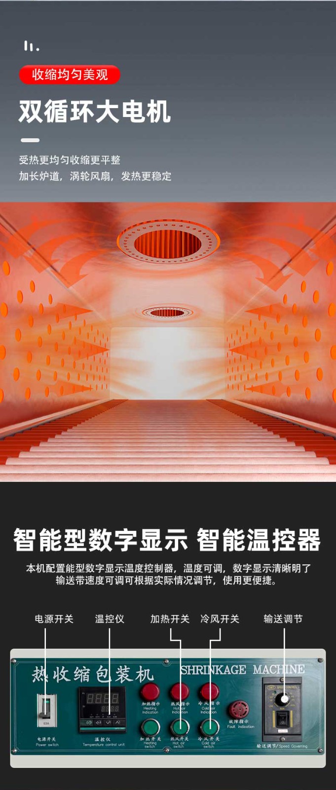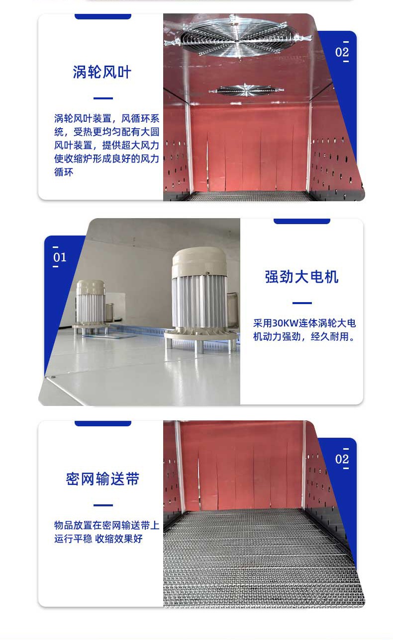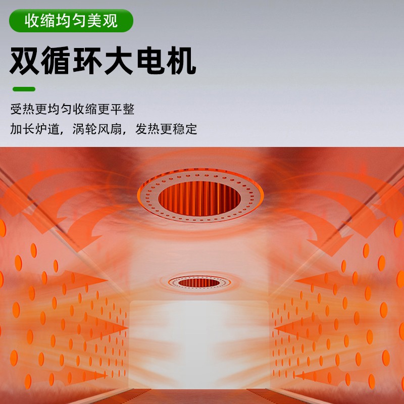 熱收縮定型:封切后的產(chǎn)品進(jìn)入熱收縮區(qū),通過(guò)高溫?zé)犸L(fēng)循環(huán)系統(tǒng)使膜材均勻收縮,緊密貼合產(chǎn)品輪廓。