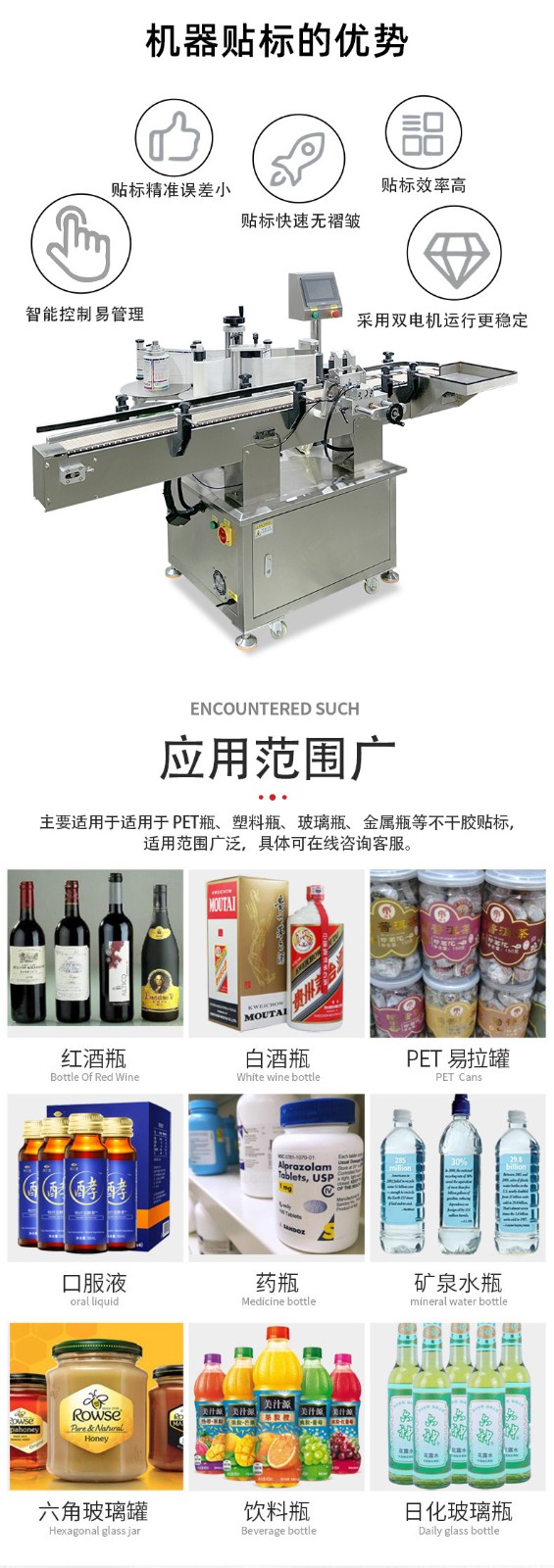 圓瓶類產(chǎn)品的貼標(biāo),可貼單標(biāo)和雙標(biāo),正背雙標(biāo)間距可靈活調(diào)整,部分機(jī)型還具備錐形瓶貼標(biāo)功能。精準(zhǔn)定位、高效智能、靈活兼容與合規(guī)耐用,可顯著提升產(chǎn)線自動(dòng)化與貼標(biāo)良率。