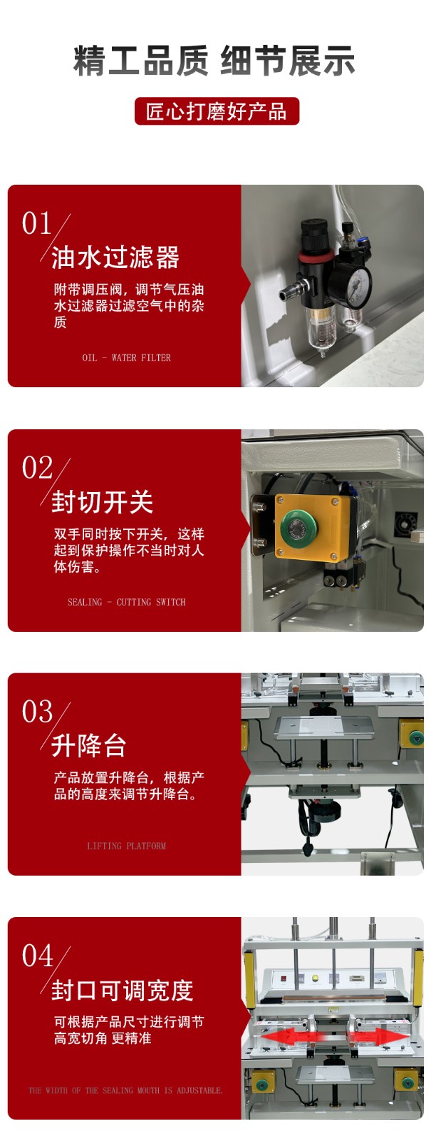 - 調(diào)整參數(shù):根據(jù)包裝材料的材質(zhì)、厚度以及產(chǎn)品的包裝要求,調(diào)整封口溫度、封口時(shí)間、切角尺寸和角度等參數(shù)。一般來說,較厚的材料需要較高的封口溫度和較長的封口時(shí)間。