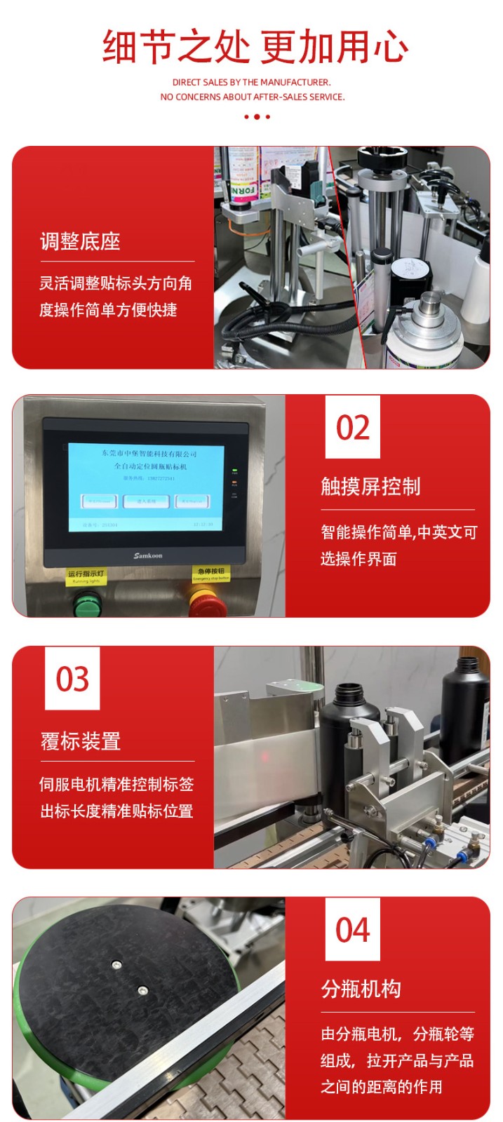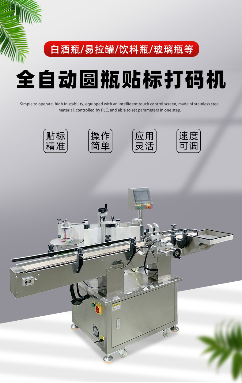 • 貼標:當圓瓶到達貼標位置時,貼標機構的標簽牽引裝置根據預設的標簽長度,將標簽從標簽卷上牽引出來,貼標頭在控制系統的指令下,將標簽準確地貼附在圓瓶表面。同時,壓標裝置對標簽進行壓實,使其牢固地粘貼在瓶身上。